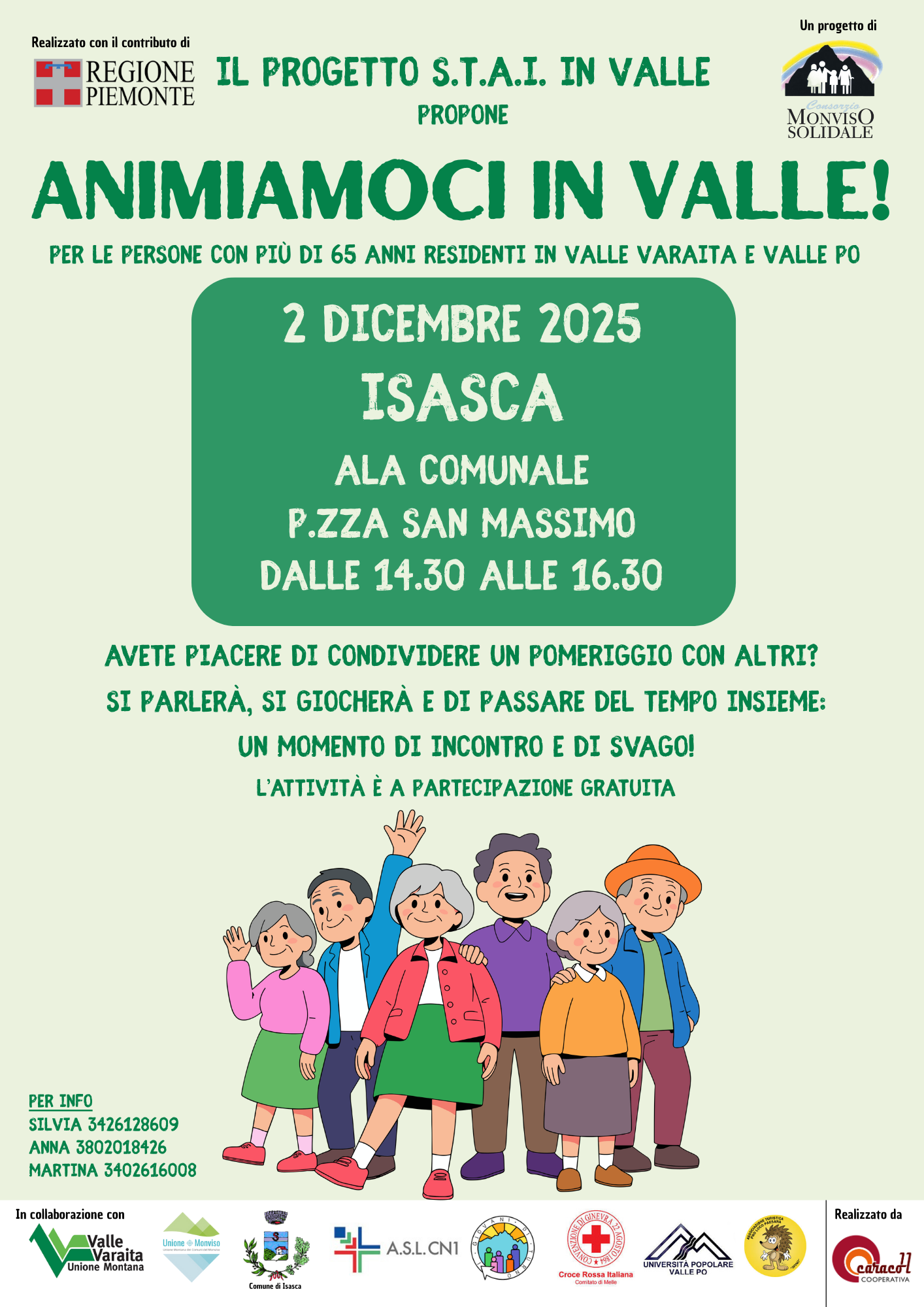 Descrizione 2 dicembre 2025 presso Ala comunale di Isasca dalle 14.30 alle 16.30 per le persone con più di 65 anni residenti in Valle Varaita e Valle Po
